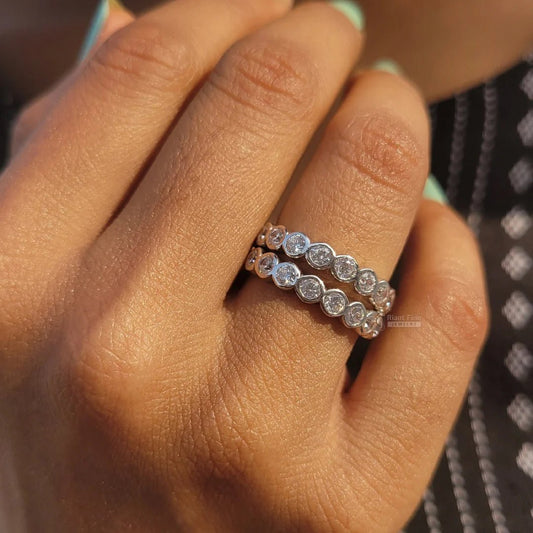 14K Gold Bezel Round Diamond Eternity Wedding Band Set