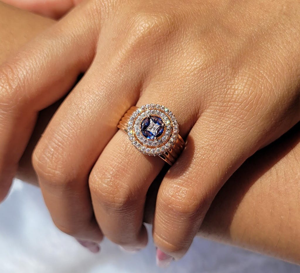 Discover the Timeless Beauty of the Princess Lab Grown Diamond Double Halo Sapphire Bridal Wedding Ring. This Breathtaking Piece is Expertly Designed to Symbolize Everlasting Love and Commitment. With a Princess-cut Lab-grown Diamond as the Centerpiece, Surrounded by a Double Halo of Round and Marquise cut Lab Grown Diamonds, This Ring Exudes Sophistication and Grace.